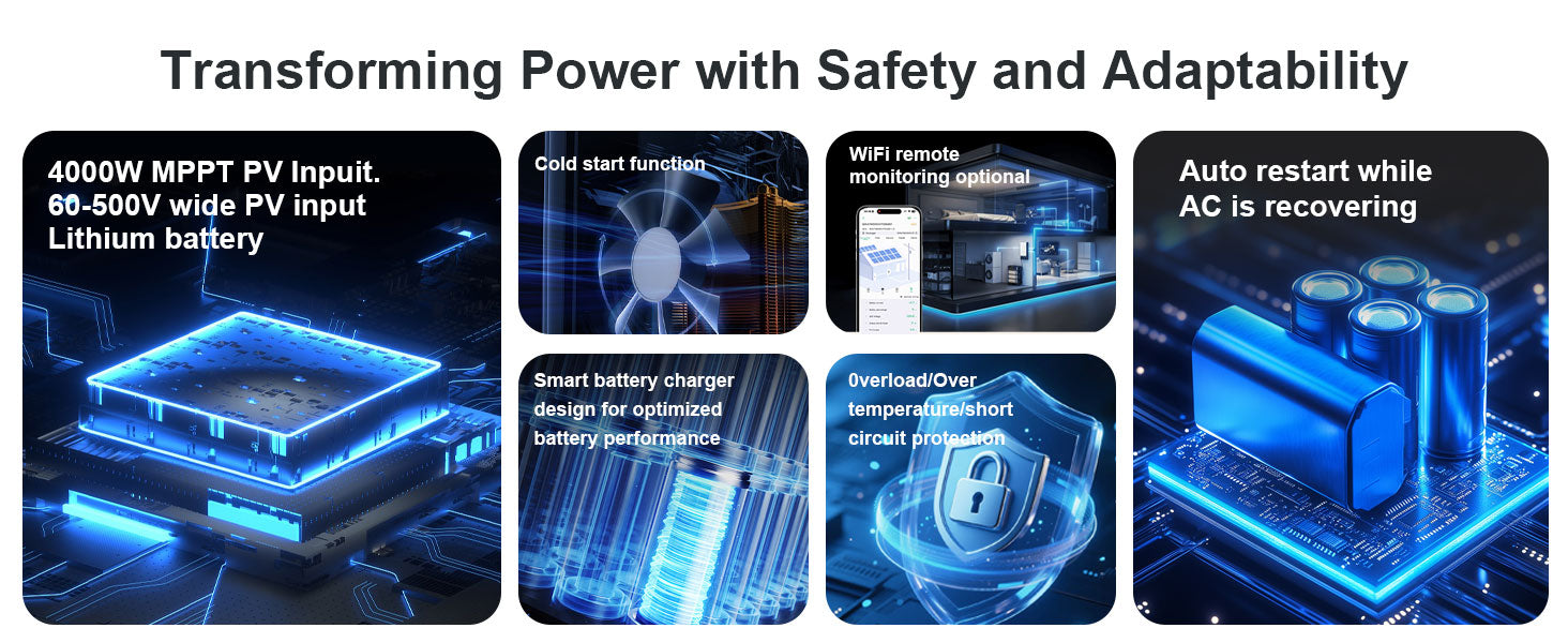 With 4000W rated power, 7000W peak power, >96% efficiency, dual cooling fans, and LCD monitoring, it’s the smart choice for stable, high-performance off-grid systems or reliable backup power solutions.