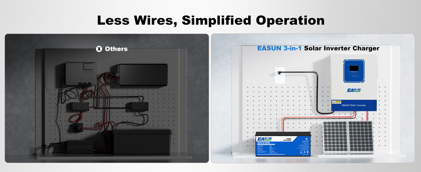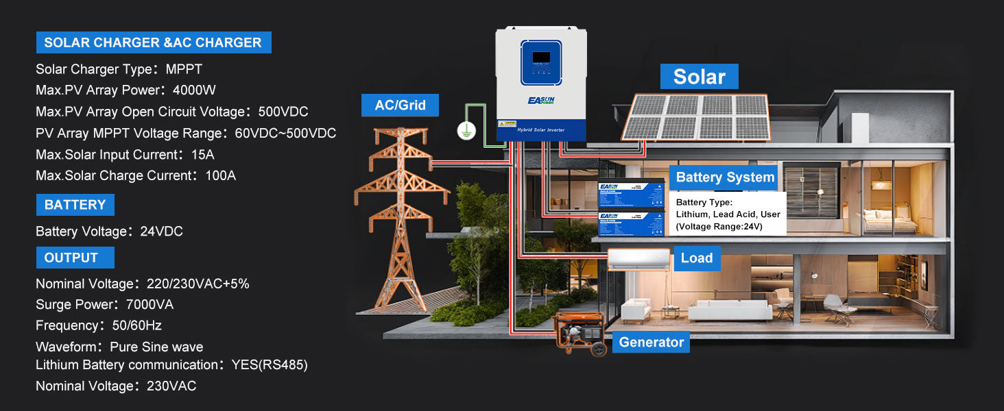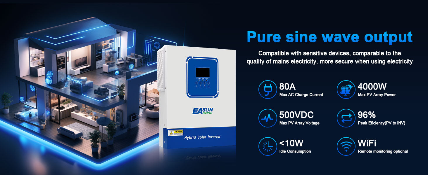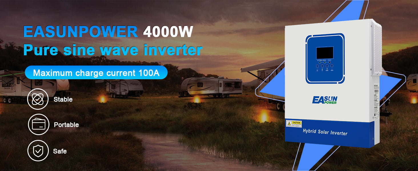 The Easunpower 4000W solar inverter-charger combines an MPPT solar charge controller, pure sine wave inverter, and battery charger in one compact unit for seamless energy management.