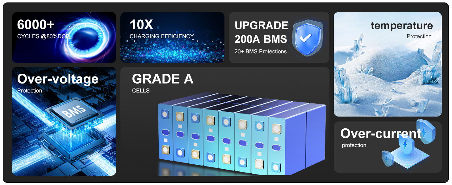 Our wall-mounted 48V LiFePO4 solar battery combines top-tier safety with over 6,000 charge cycles, delivering a stable output of up to 5.12 kW.