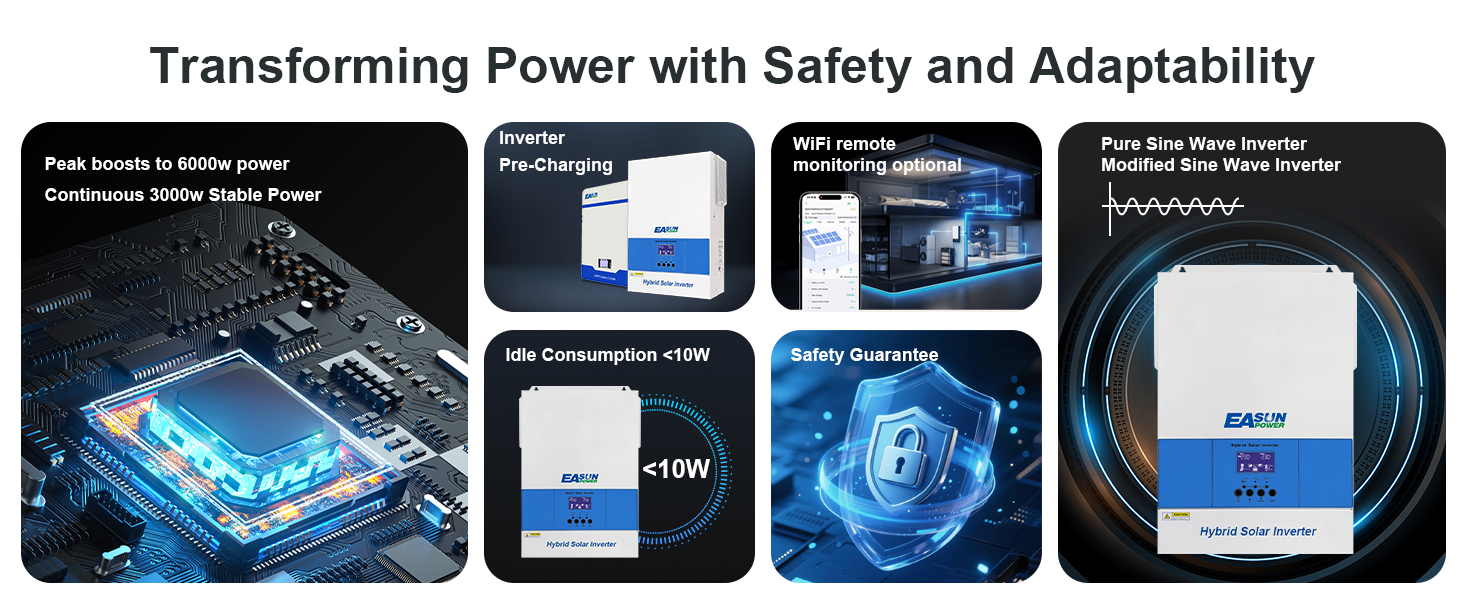 The EASUN 48V 6200W solar inverter combines solar input, grid power, and battery charging in one powerful unit — making it easy to build a reliable and efficient home energy system that supports both off-grid and hybrid power setups.