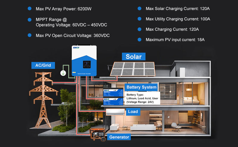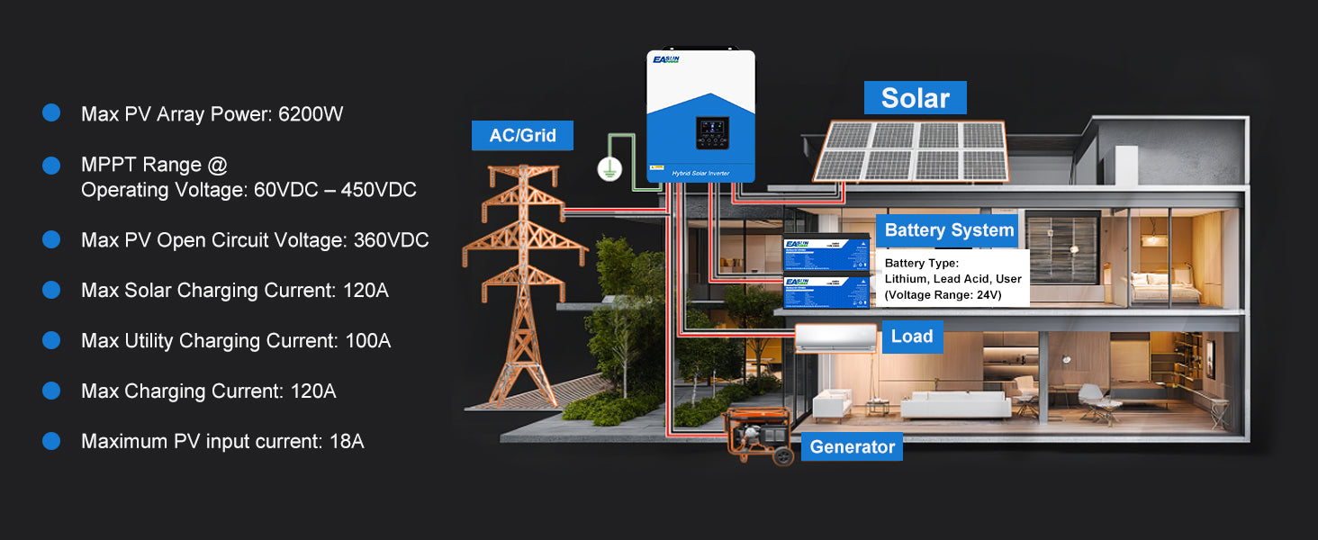 6.2KW Solar Inverter 48V Photovoltaic Hybrid Inverter 230VAC 120A MPPT Charger - Easunpower