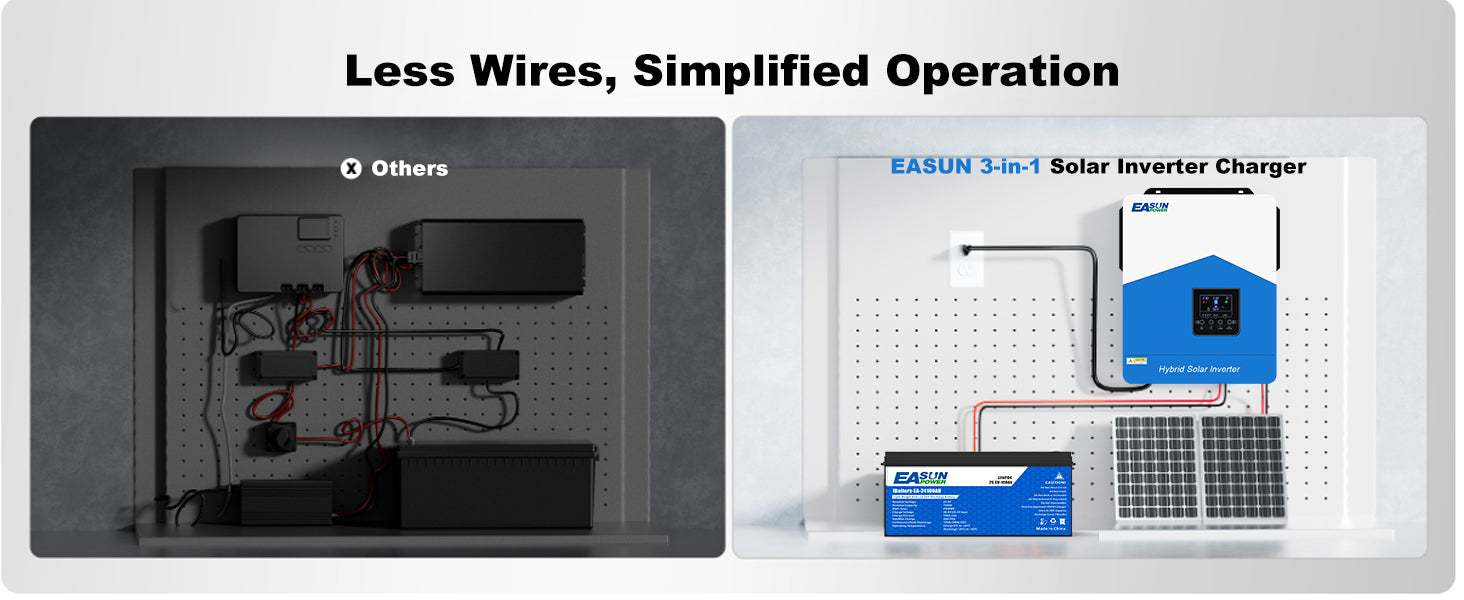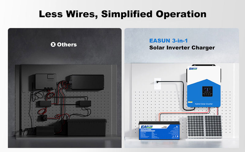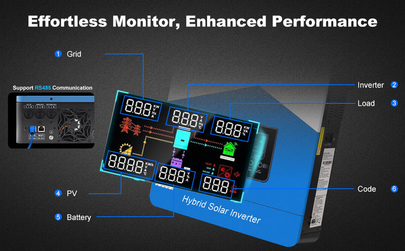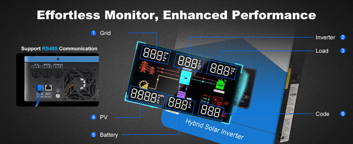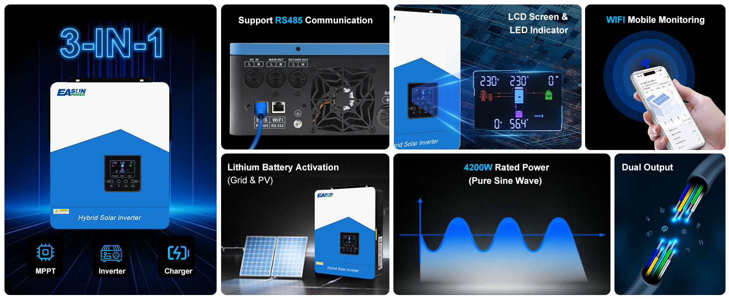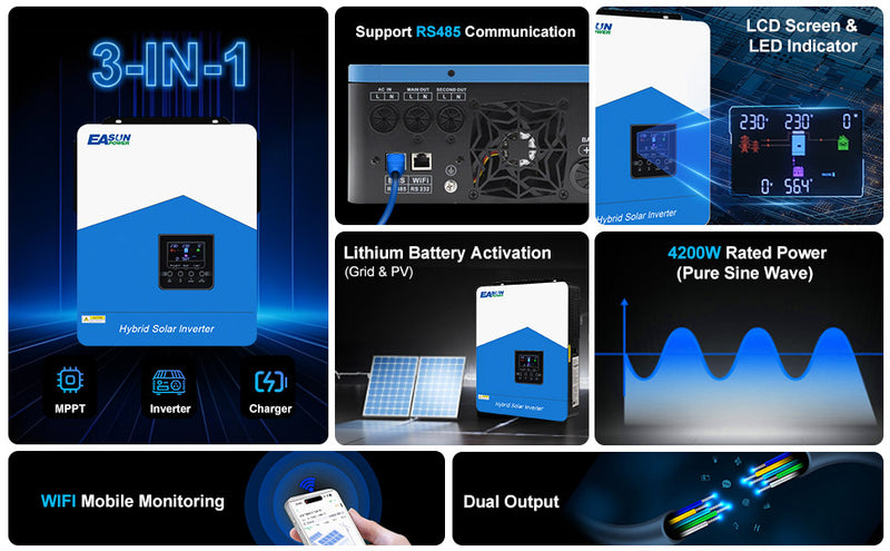 Featuring an all-in-one design, 6.2kW rated power (up to 6.5kW peak), an easy-to-read LCD display, WiFi app monitoring, and an RS485 interface, the EASUN POWER 48V hybrid inverter with built-in battery charger delivers efficient, smart, and stable energy management for everyday home use.